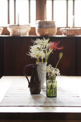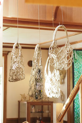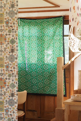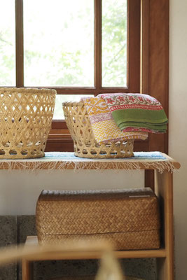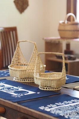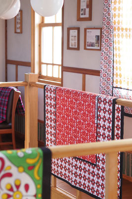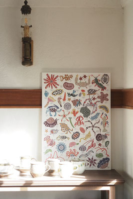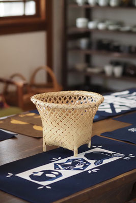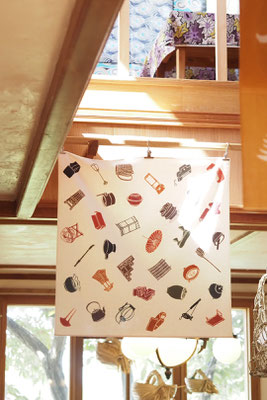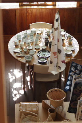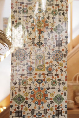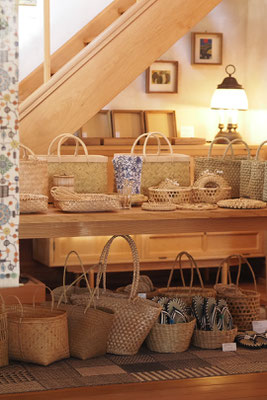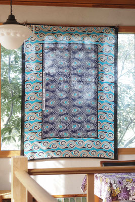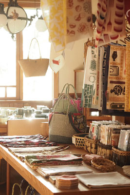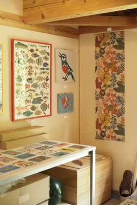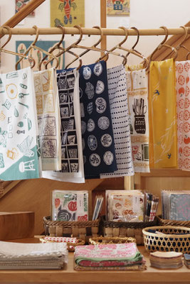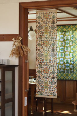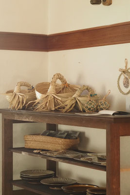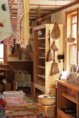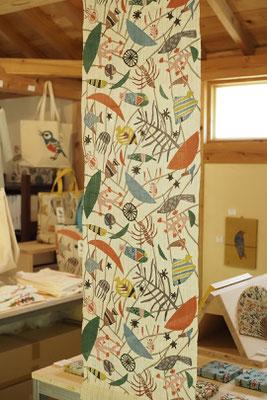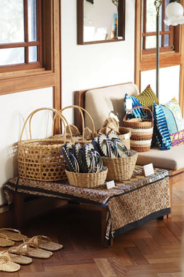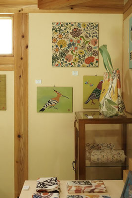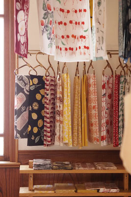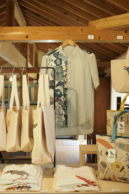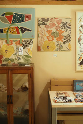 ヘリテージも夏休みにはいりまして、2年ぶりに沖縄の【紅型工房べにきち】吉田誠子さんをたずねました。沖縄本島北部の瀬底島にある紅型工房で、フクギ並木に囲まれたのどかな所にひっそりとあります。瀬底島は本島から橋でつながっていて、美しい海に囲まれています。その美しい自然に囲まれた環境でうみだされる楽しくて美しいべにきちデザインが、ほんとうに大好き!2年前は工房だけだった場所にギャラリーを再開されて、小さな空間にぎゅっと紅型作品が並んでいました。