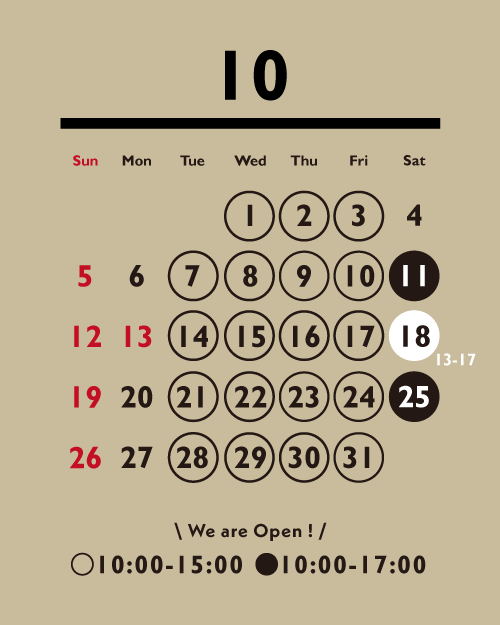 10月オープン日のおしらせです。まる印がオープン日で、平日火曜~金曜は10時から15時まで、土曜は17時まで営業しています。また10月は子どもの学校行事のため、日・月曜の定休日以外にもお休みをいただいたり、時短営業の日もあります。ご来店の際は、必ず営業日時をご確認のうえお店にむかってください。最新の情報は毎日インスタグラムで発信しています。